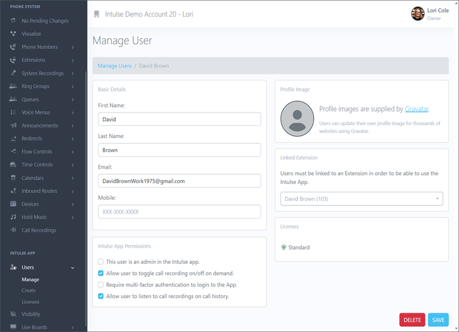 Users are the people who can login and use the Intulse App. These are typically all of the employees in your organization. Each user is linked to an extension on your phone system and can be assigned special licenses. You can create as many users as you like for free but users that are not linked to an extension will not be able to login to the Intulse App. You do not need to create users for every extension. For example, a conference room extension does not need a user.