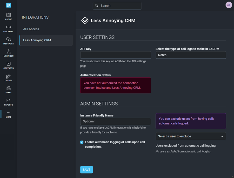 Only system administrators in the Intulse App can update the following settings for your LACRM integration.