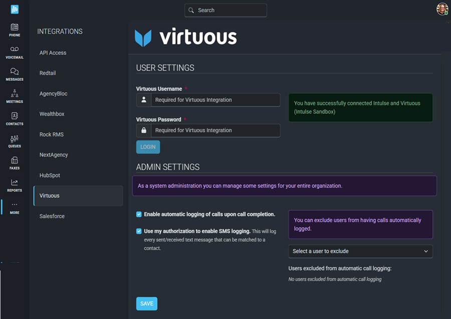 Only system administrators in the Intulse App can update the following required settings for your Virtuous integration.