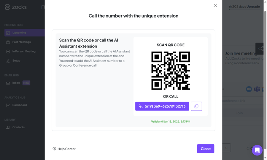 - In Zocks, click Upcoming > Start Call to get your AI Assistant phone number and unique extension. These unique extension codes are time-limited to make your account more secure.