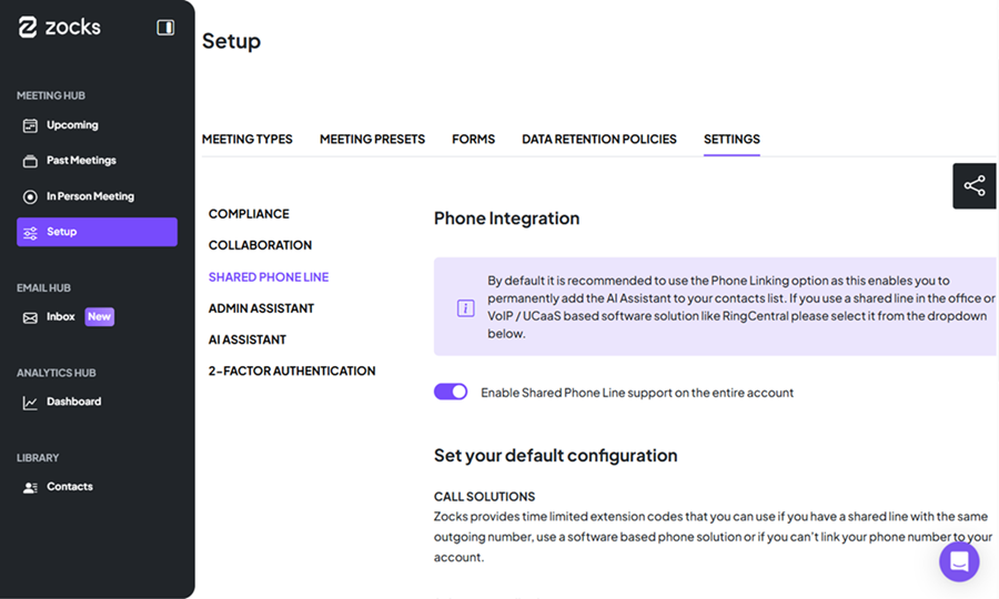 - Make sure this feature is included in your Zocks subscription tier. Navigate to Setup > Settings > Shared Phone Line.