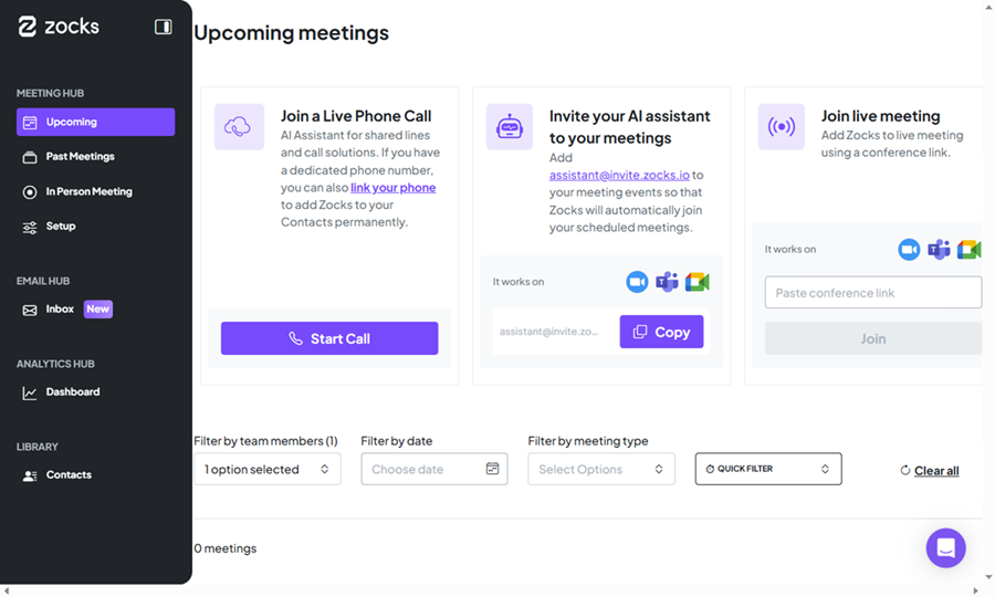 - In Zocks, click Upcoming > Start Call to get your AI Assistant phone number and unique extension.