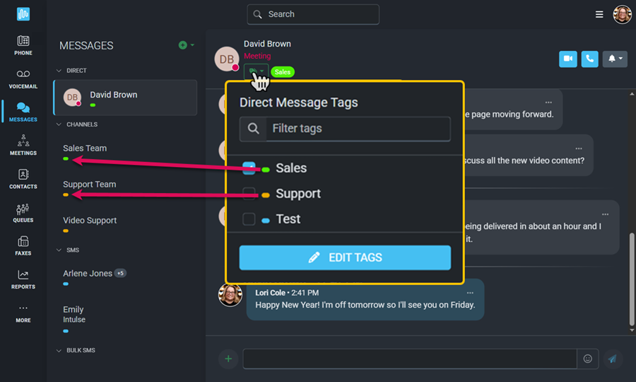 New incoming messages will be indicated by a blue badge showing the number of unread messages, and each new message will be outlined with a yellow box and show the name of the user who sent it.