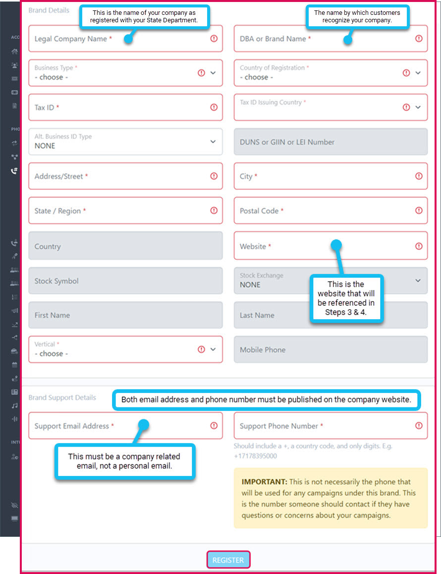 Complete the BRAND REGISTRATION FORM - The information entered here MUST match what's on your website!