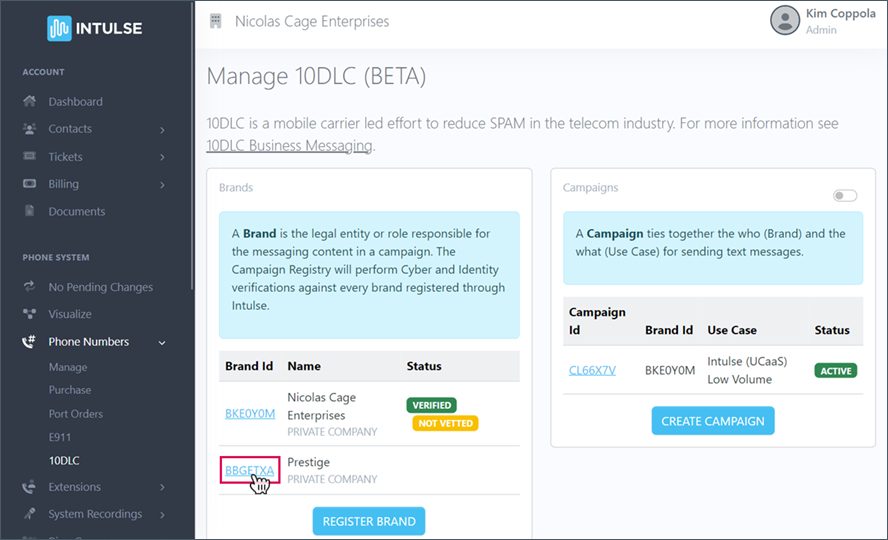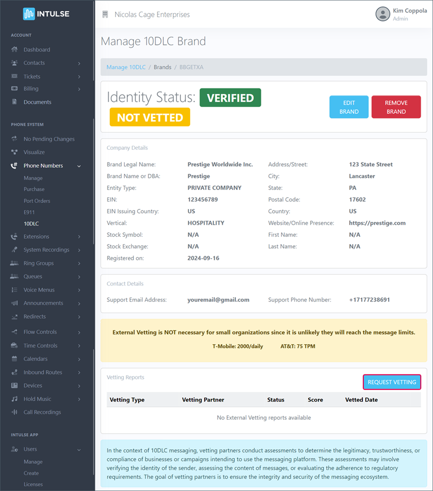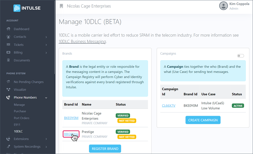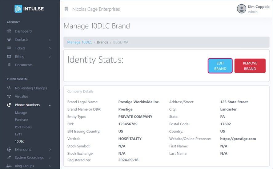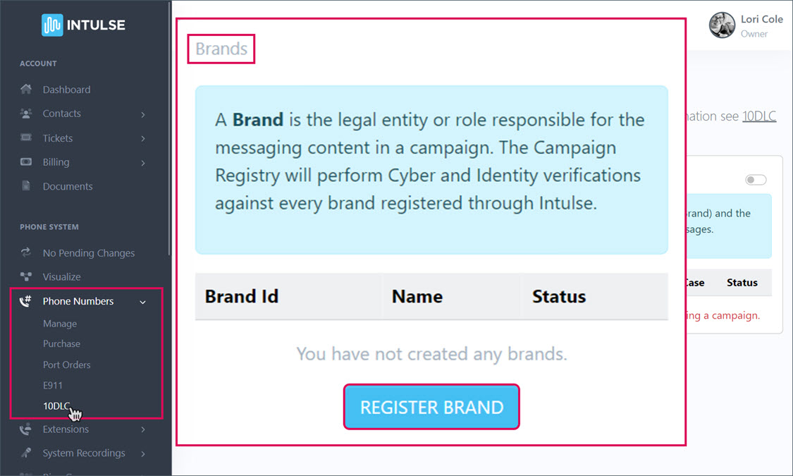 A "Brand" is the company that will use SMS to communicate with customers. TCR will perform Cyber and Identity verification against every brand registered through Intulse.
