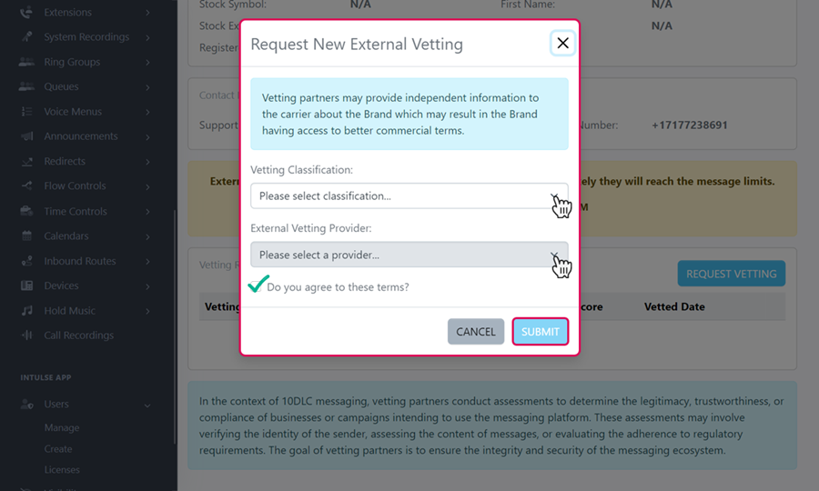 - Enhanced Vetting: This has a $120 one time fee and can take approximately 7 days. (Enhanced vetting will provide a more detailed report and vetting support from TCR. Intulse support will be available regardless of what type of vetting you select.)