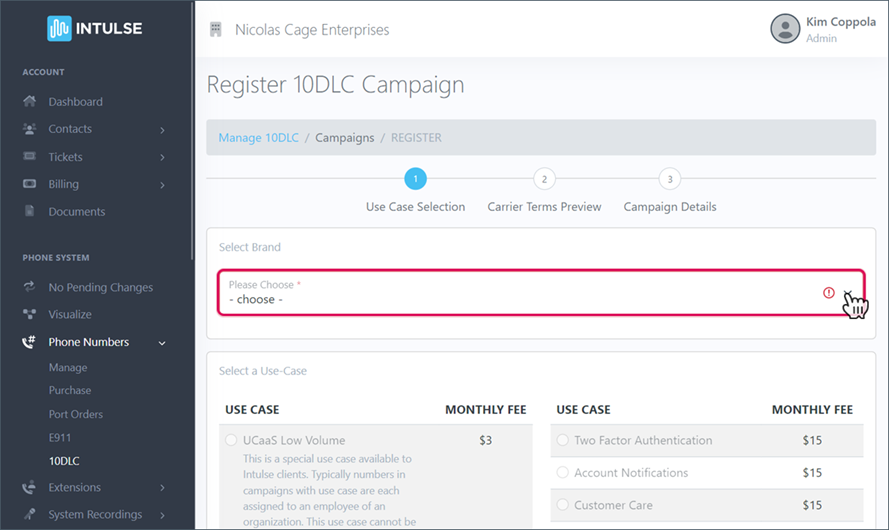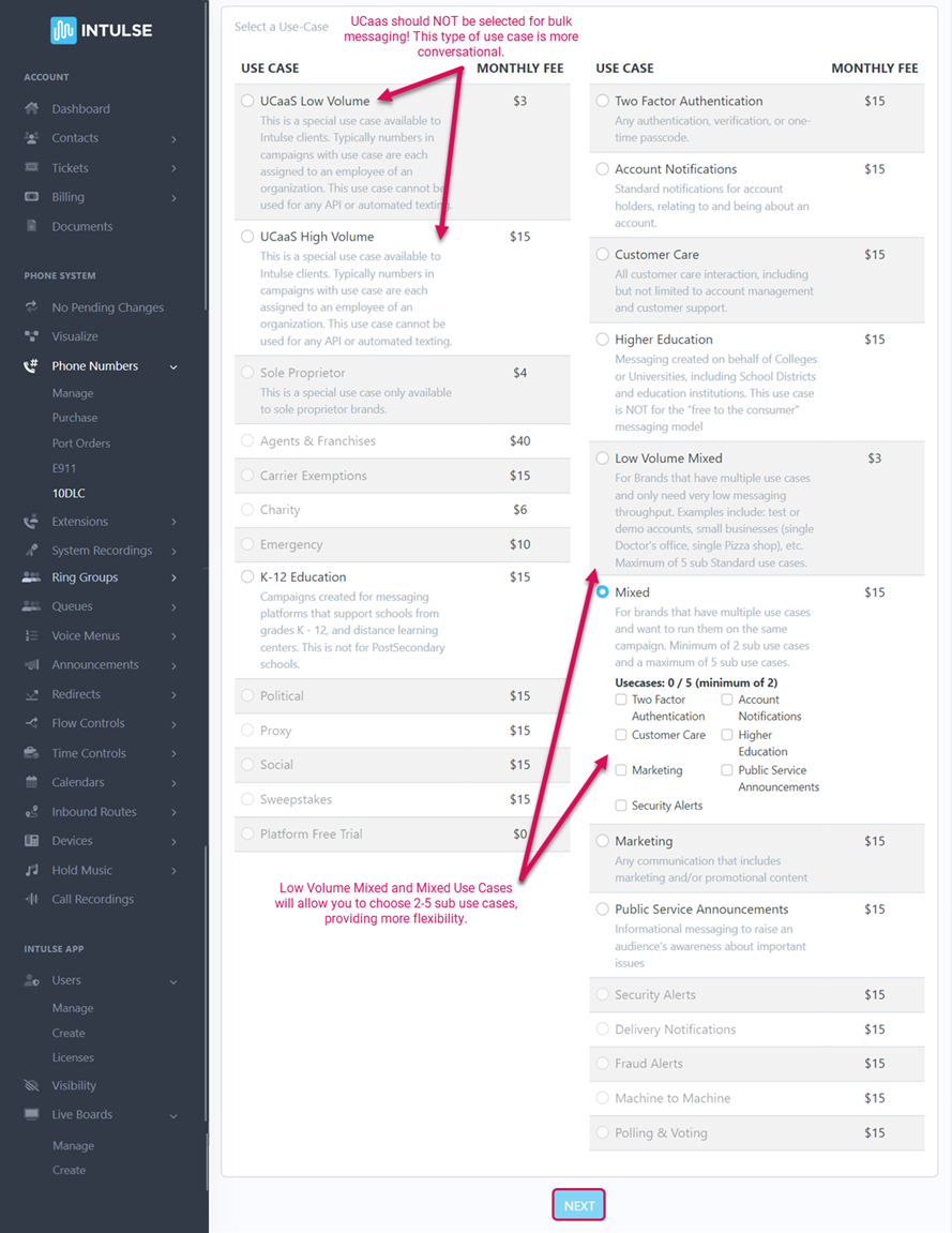 SELECT ONE USE CASE for this campaign. You will be presented with a selection of use cases based on the business type selected when registering your brand. Click HERE for a full description of each use case option.