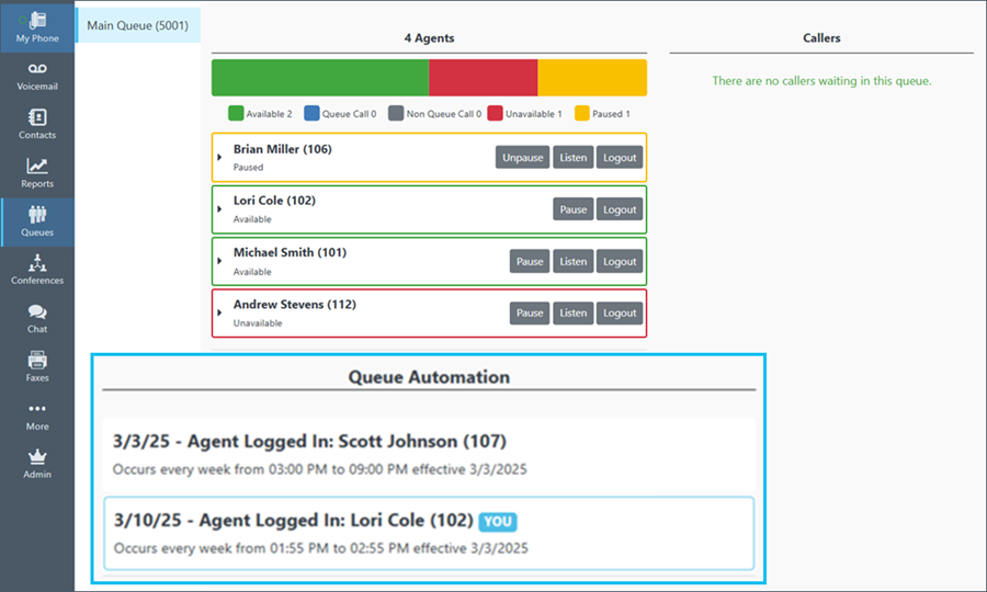 Use the Automation tool in the Account Center to schedule when queue agents are live and available to receive calls.