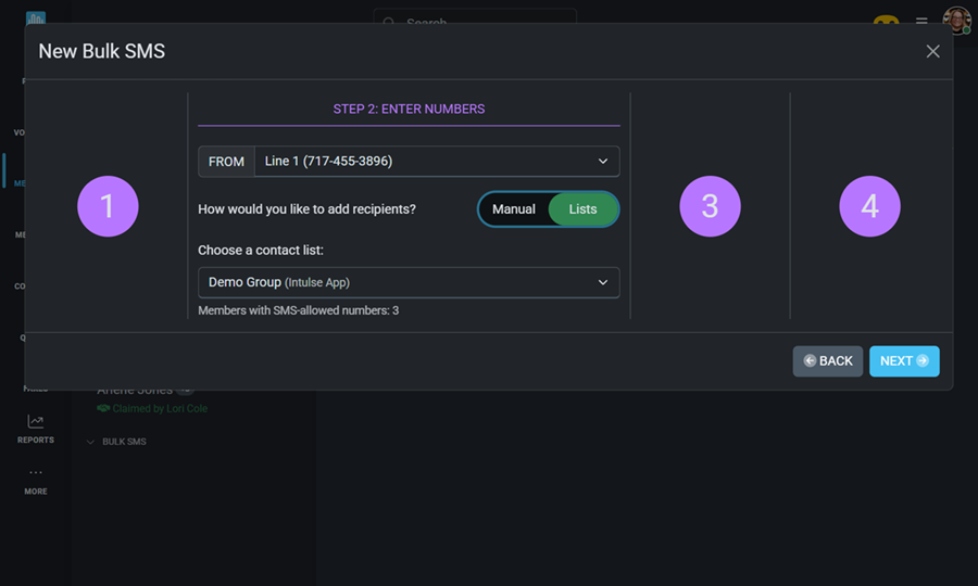On this screen, you will select the phone numbers for this message. First, select your Intulse phone number from which the message will be sent. Then enter the phone numbers for the recipients of this text. You have 2 options for how to enter these numbers: