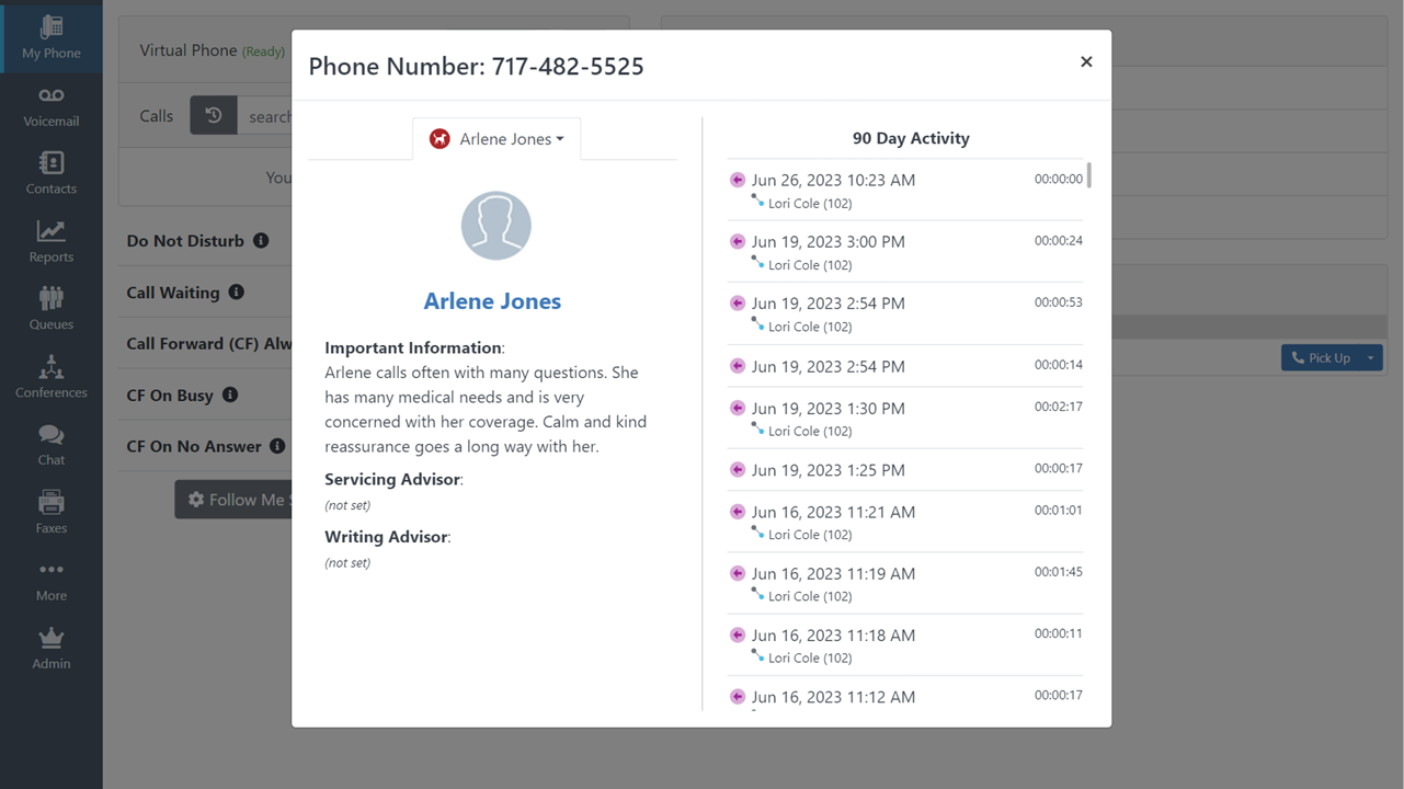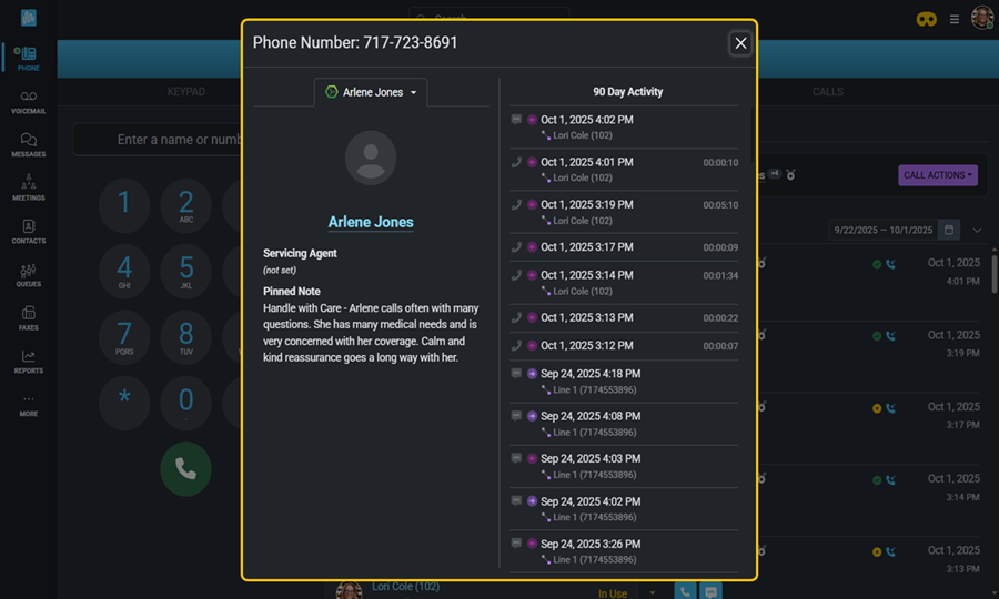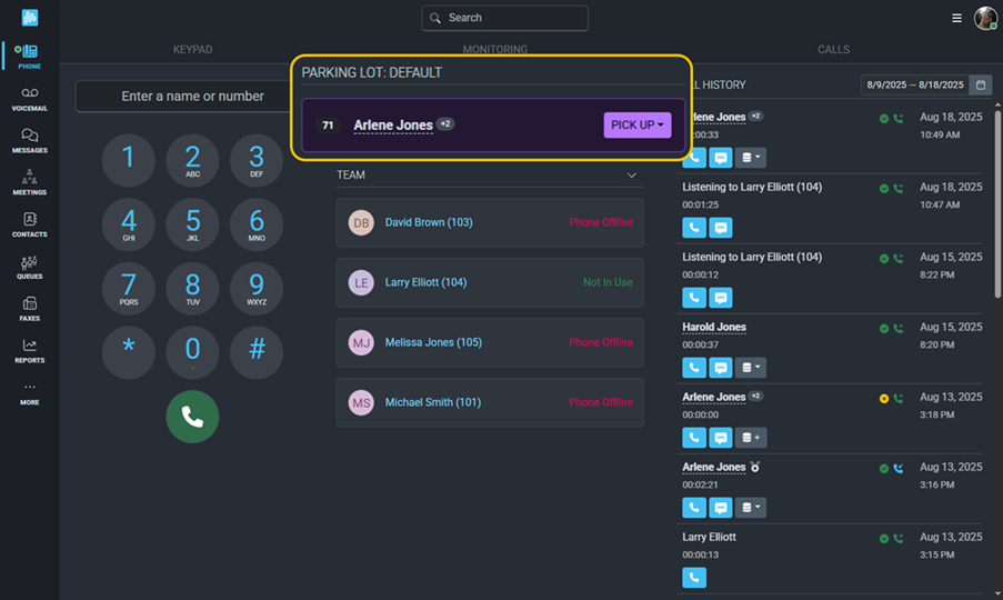 The parked call can be picked up by any extension within your phone system. That means if the intended recipient isn’t at their desk, they can still pick up the call from any other extension. To pick up a call, simply click on the parked call. Use the drop-down menu to choose whether to pick up the call using your virtual phone or physical device.