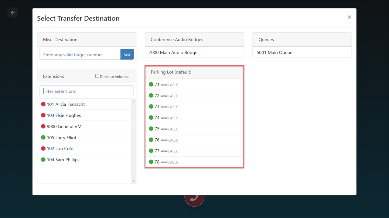 When you need to put a caller on hold or transfer them to another extension in your organization, you can simply transfer the call to an empty space in the parking lot. Select “Transfer” from the Call Actions drop-down menu or the “Transfer” button on the active call screen. Select any available spot in the Parking Lot.