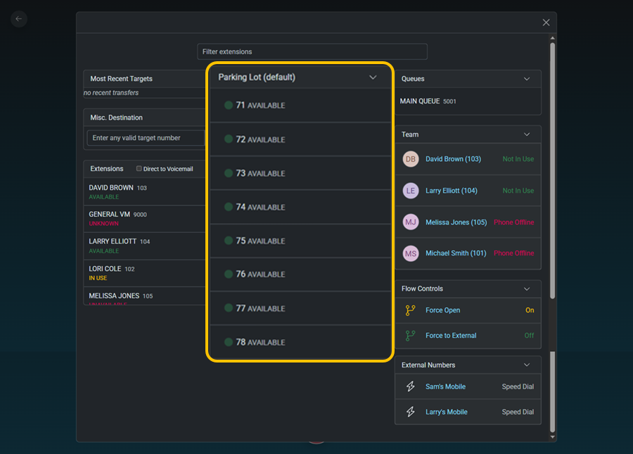 You can also assign parking spots to buttons on your physical phone, allowing you to easily transfer calls on that device as well. BLF buttons for parking spots on physical phones can be labeled for specific users so a user will automatically know that any calls parked in a specific spot are for them.