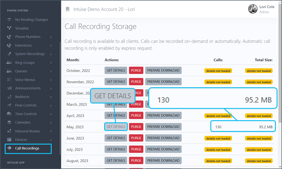 View the number and size of calls recorded per month. Download and purge calls by month.