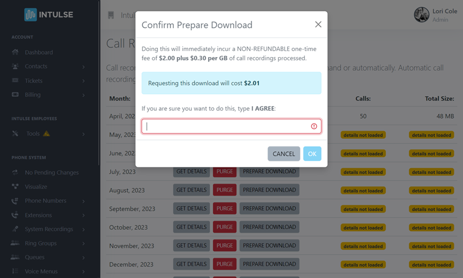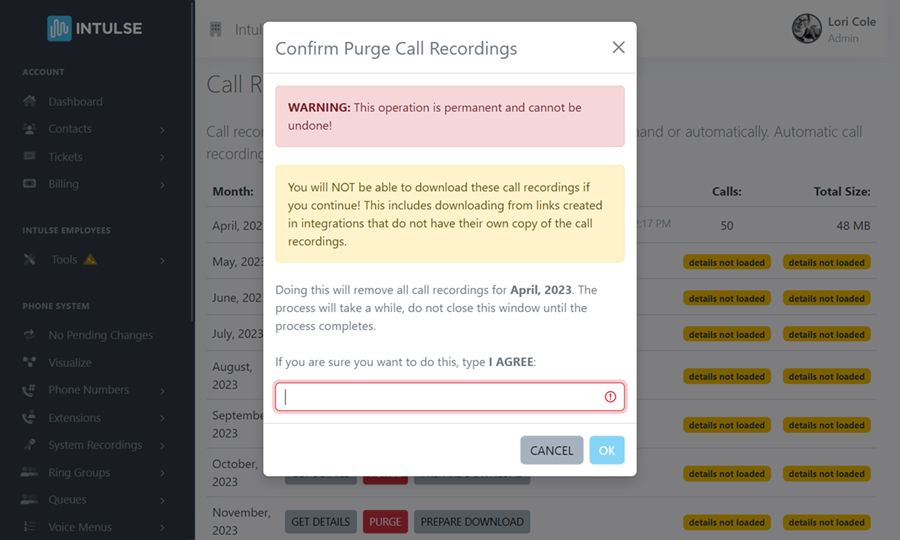 You also have the option to purge call recordings per month. This action is permanent and cannot be undone so please be sure you have any files you need before completing the purge. Once you complete this process, you will no longer be charged the monthly storage fee for these call recordings.