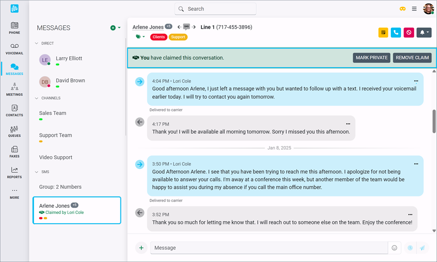 When you claim an SMS chat, other users are still able to view and participate in the conversation. The claim simply lets them know you are taking the lead and will make sure messages are read and replied to. Any message that has been claimed by a user will have a Claimed designation below the name or phone number in the SMS conversation list. A claim can be removed at any time.