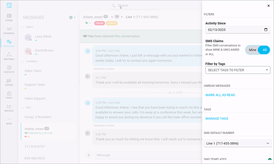 Use the filter feature in the context menu to select whether you want to see all SMS messages for your organization or only your claimed messages along with any that have not yet been claimed. This option will filter out any messages that have been claimed by other users. Click here for more information about claiming and filtering SMS conversations.
