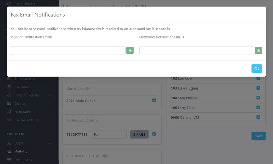 Most notification settings are controlled by each individual user in the Intulse App. Email notifications for faxes, however, are controlled on the Visibility screen in the Account Center by system admins.