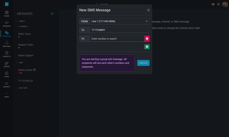 Group messaging works just like a group text on your cell phone. Each member of the conversation will see every comment in the thread. If you want to send bulk messages that are sent to each contact as an individual communication, check out our Bulk Messaging option. Click here to learn about all the types of messages available in the Intulse app. Expand the SMS Text Messages heading to learn more about group texting.