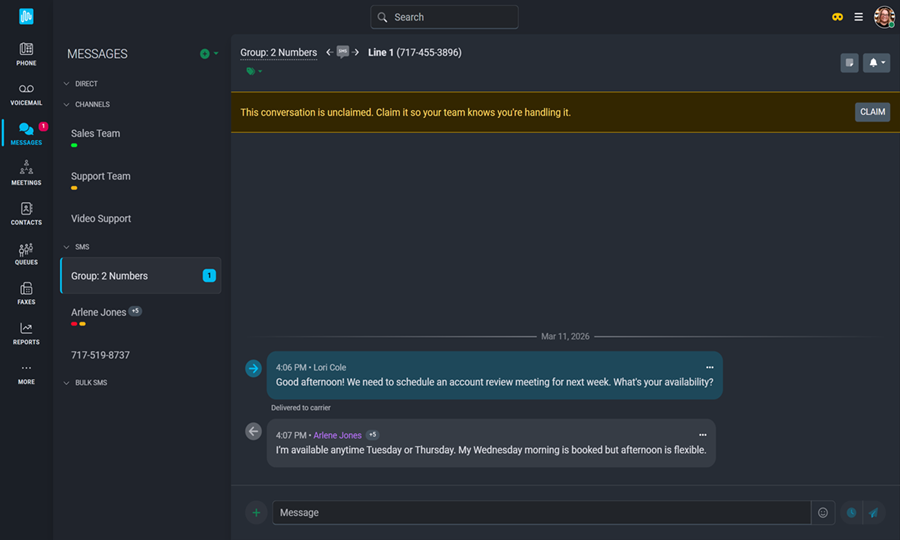 Once the conversation has been started, each comment will display the date, time, and name of the contributor. Just like any other SMS message in the app, these group conversations can be tagged and claimed. The conversation can be renamed by clicking on the group name at the top of the screen.