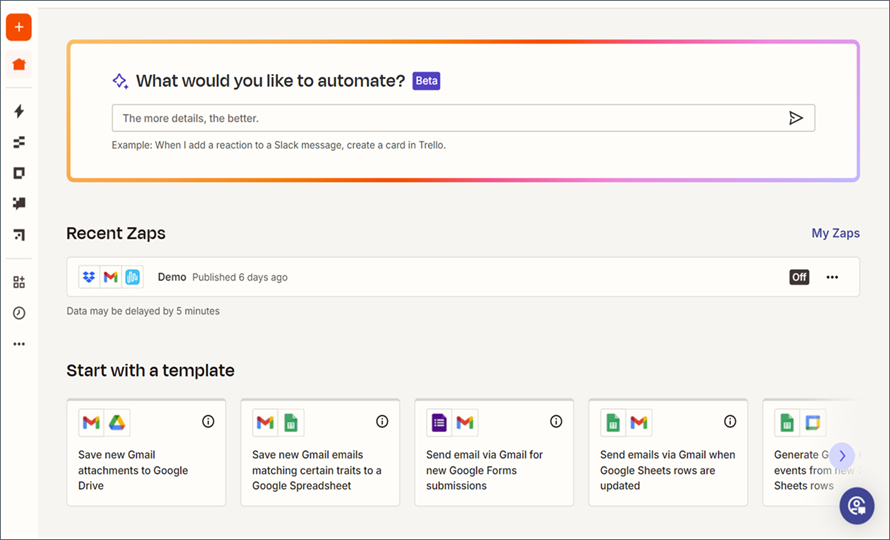 After selecting your apps, tell Zapier what you want your automation to accomplish and a template will be created for you. Then all you need to do is follow the prompts to sign into your apps and fill in the details related to your Zap.