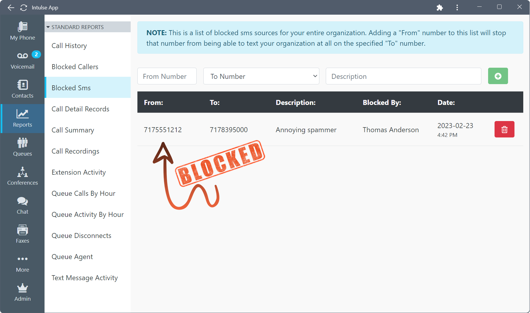 Adding a number to the list will stop that number from being able to text your organization at all on the number you specify. Numbers on this list can be changed or deleted at any time by your system administrator. Details on how to manage this report can be found in the "Intulse App" walkthrough on the support site, under the reports tab.