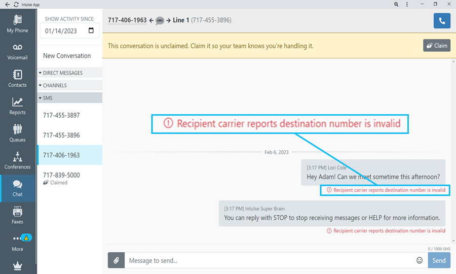 Any text messages sent or received via your organization’s Intulse numbers can now be claimed by a member of your organization. This lets the rest of your team know that the conversation is being handled by a specific individual. Additionally, the conversation can be marked as private, which will not stop others from seeing that the conversation exists; however, it will make the content invisible to anyone other than the user who has claimed it. More information on claiming conversations can be found in the "Intulse App" walkthrough on the support site, under the chat tab.