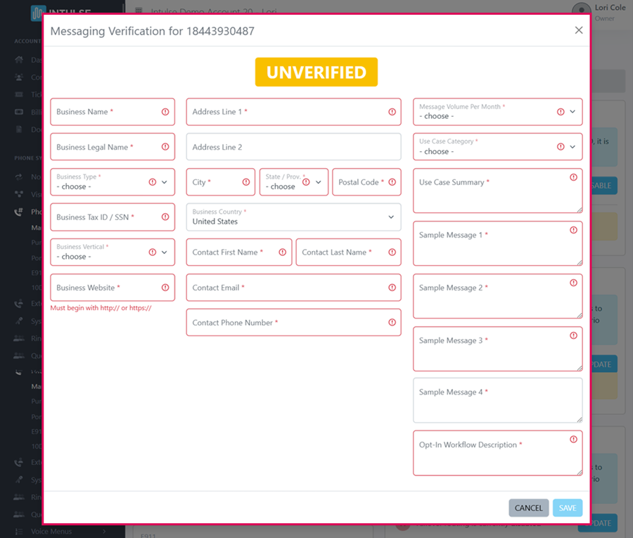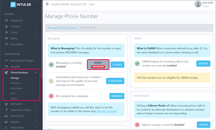 Once your number is enabled, click on the button to Verify your number for messaging.