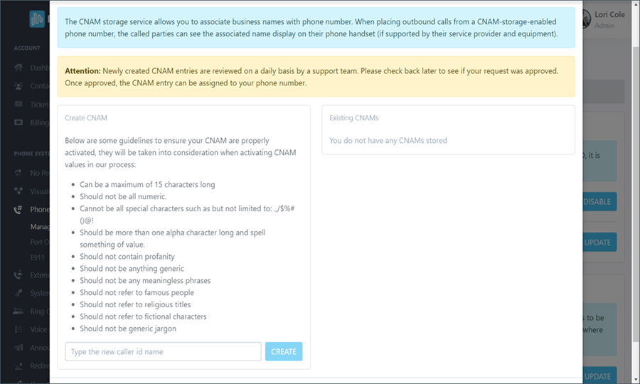 - On this screen, read the guidelines for what your outbound caller ID name can be, then type your new caller ID name and click the "CREATE" button.