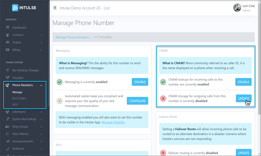 - Select "UPDATE" next to CNAM storage.