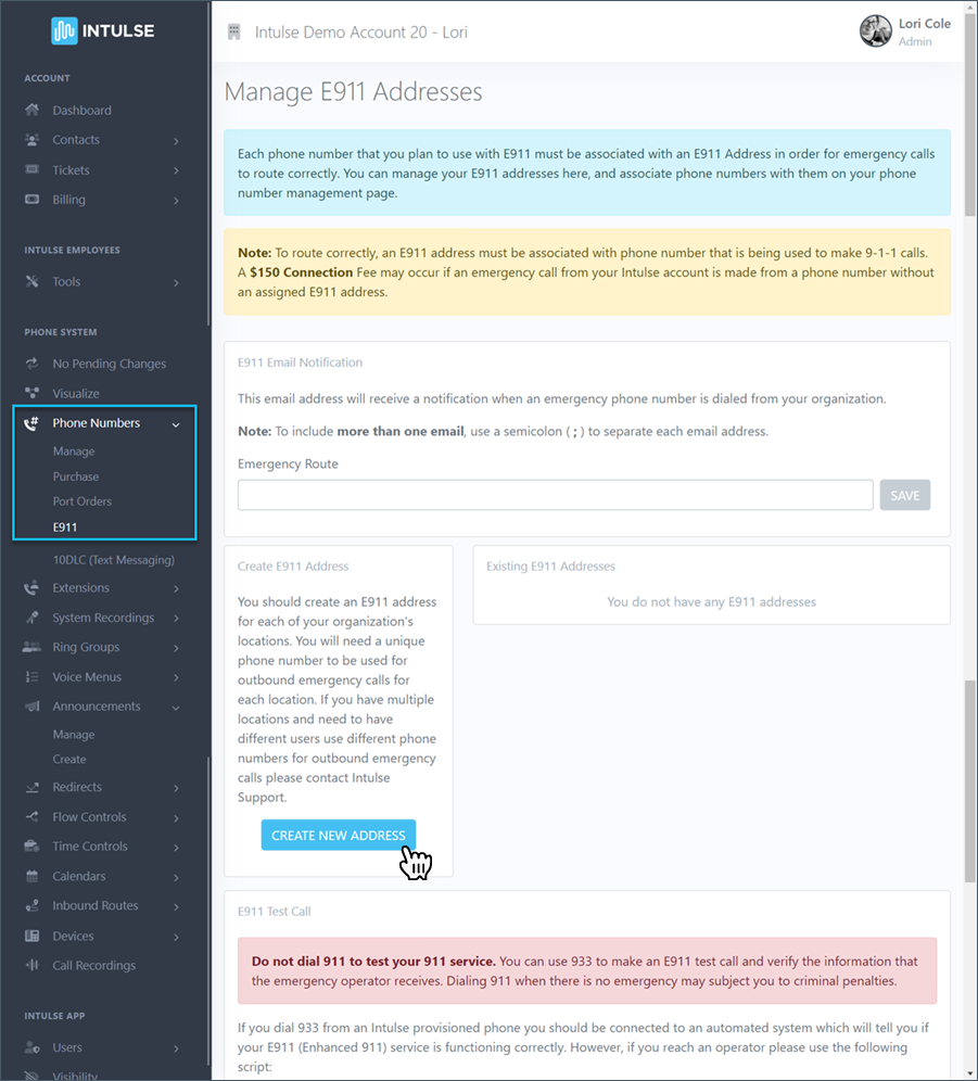 Similar to the last step, here you will enable some settings for each of your Intulse phone numbers. Setting up E911 on a phone number will assign a physical address to that phone number. This is the address that emergency responders will see should you ever need to dial 911 from an Intulse phone. We will also enable outbound caller ID, so devices receiving your calls will display the name of your organization instead of a phone number.