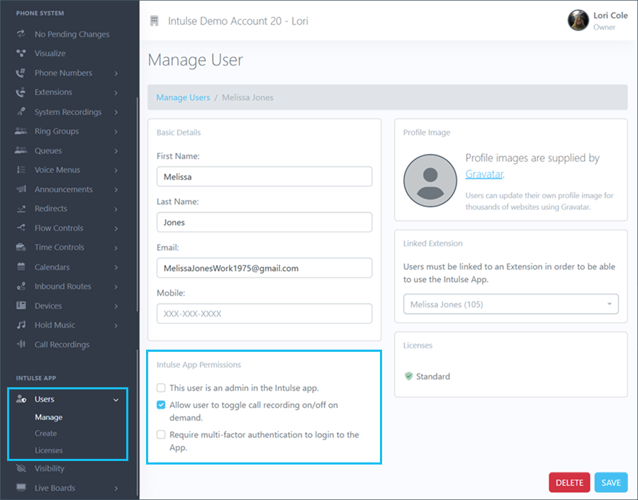 Users are the people who can login to the Intulse App and use the Virtual Phone. These are typically all of the employees in your organization. Each user is linked to an extension on your phone system and can be assigned special licenses. You can create as many users as you like for free but users that are not linked to an extension will not be able to login to the Intulse App. You do not need to create users for every extension. For example, a conference room extension does not need a user.